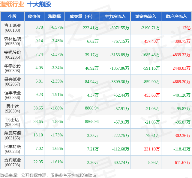 个股表现方面,造纸行业当日领跌股为青山纸业(600103),该股当日报收3.7,下跌6.57%,成交量222.41万,主力资金净流出8971.55万元。森林包装(605500)以下跌3.48%紧随其后,该股当日成交量6.62万,主力资金净流出767.15万元。除此之外,安妮股份(002235)、华泰股份(600308)、景兴纸业(002067)均进入当日熊股之列。具体个股列表见下表: