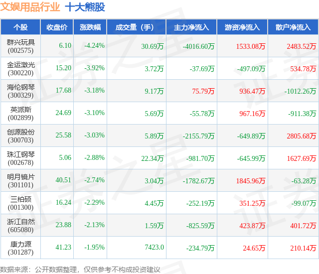 个股表现方面,文娱用品行业当日领跌股为群兴玩具(002575),该股当日报收6.1,下跌4.24%,成交量30.69万,主力资金净流出4016.6万元。金运激光(300220)以下跌3.92%紧随其后,该股当日成交量3.72万,主力资金净流出37.69万元。除此之外,海伦钢琴(300329)、英派斯(002899)、创源股份(300703)均进入当日熊股之列。具体个股列表见下表: