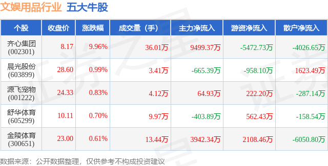 个股表现方面,文娱用品行业当日领涨股为齐心集团(002301),该股当日报收8.17,上涨9.96%,成交量36.01万,主力资金净流入9499.37万元。晨光股份(603899)以上涨0.99%紧随其后,该股当日成交量3.41万,主力资金净流出665.39万元。除此之外,源飞宠物(001222)、舒华体育(605299)、金陵体育(300651)均进入当日牛股之列。具体个股列表见下表: