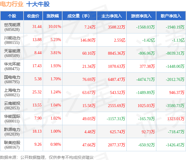 个股表现方面,电力行业当日领涨股为世茂能源(605028),该股当日报收31.44,上涨10.01%,成交量7.24万,主力资金净流入3508.22万元。川能动力(000155)以上涨5.23%紧随其后,该股当日成交量146.8万,主力资金净流入2.55亿元。除此之外,天富能源(600509)、华光环能(600475)、国电电力(600795)均进入当日牛股之列。具体个股列表见下表: