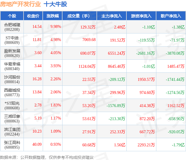 个股表现方面,房地产开发行业当日领涨股为合肥城建(002208),该股当日报收14.54,上涨9.98%,成交量129.32万,主力资金净流入2.48亿元。ST中迪(000609)以上涨4.98%紧随其后,该股当日成交量7070.0,主力资金净流入191.52万元。除此之外,盈新发展(000620)、华夏幸福(600340)、沙河股份(000014)均进入当日牛股之列。具体个股列表见下表: