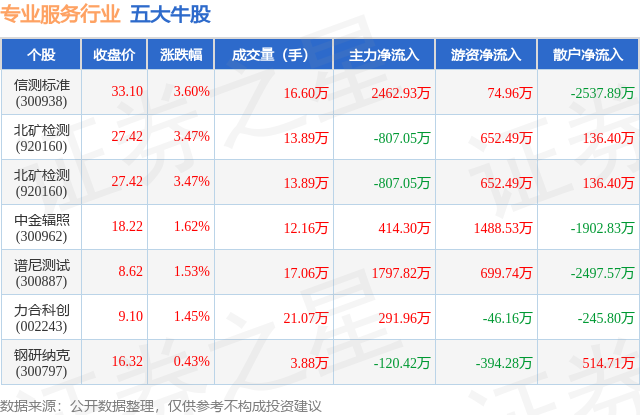 个股表现方面,专业服务行业当日领涨股为信测标准(300938),该股当日报收33.1,上涨3.6%,成交量16.6万,主力资金净流入2462.93万元。北矿检测(920160)以上涨3.47%紧随其后,该股当日成交量13.89万,主力资金净流出807.05万元。除此之外,北矿检测(920160)、中金辐照(300962)、谱尼测试(300887)均进入当日牛股之列。具体个股列表见下表: