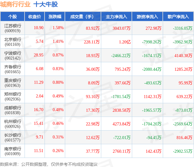 个股表现方面,城商行行业当日领涨股为江苏银行(600919),该股当日报收10.9,上涨1.58%,成交量83.92万,主力资金净流入3043.07万元。北京银行(601169)以上涨1.41%紧随其后,该股当日成交量228.11万,主力资金净流入1.2亿元。除此之外,宁波银行(002142)、齐鲁银行(601665)、重庆银行(601963)均进入当日牛股之列。具体个股列表见下表: