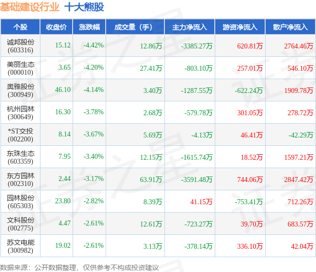 个股表现方面,基础建设行业当日领跌股为诚邦股份(603316),该股当日报收15.12,下跌4.42%,成交量12.86万,主力资金净流出3385.27万元。美丽生态(000010)以下跌4.2%紧随其后,该股当日成交量27.41万,主力资金净流出803.1万元。除此之外,奥雅股份(300949)、杭州园林(300649)、*ST交投(002200)均进入当日熊股之列。具体个股列表见下表: