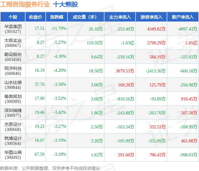 个股表现方面,工程咨询服务行业当日领跌股为华蓝集团(301027),该股当日报收17.51,下跌11.79%,成交量26.18万,主力资金净流出252.4万元。太极实业(600667)以下跌5.27%紧随其后,该股当日成交量119.59万,主力资金净流出1.63亿元。除此之外,勘设股份(603458)、同济科技(600846)、山水比德(300844)均进入当日熊股之列。具体个股列表见下表: