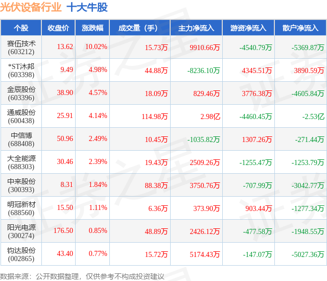 个股表现方面,光伏设备行业当日领涨股为赛伍技术(603212),该股当日报收13.62,上涨10.02%,成交量15.73万,主力资金净流入9910.66万元。*ST沐邦(603398)以上涨4.98%紧随其后,该股当日成交量44.88万,主力资金净流出8236.1万元。除此之外,金辰股份(603396)、通威股份(600438)、中信博(688408)均进入当日牛股之列。具体个股列表见下表: