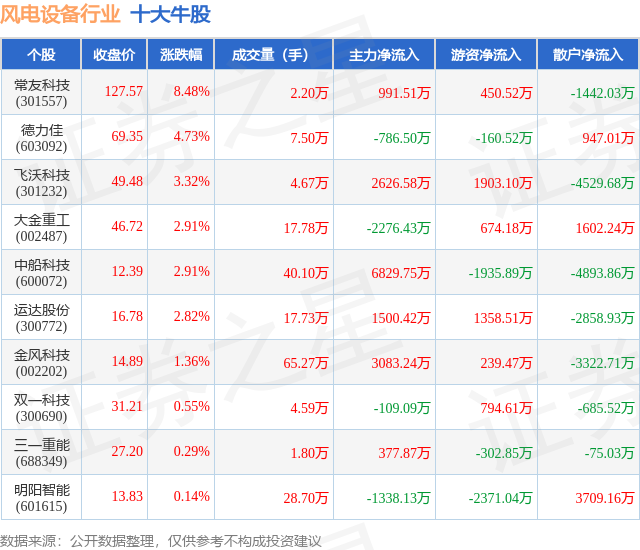 个股表现方面,风电设备行业当日领涨股为常友科技(301557),该股当日报收127.57,上涨8.48%,成交量2.2万,主力资金净流入991.51万元。德力佳(603092)以上涨4.73%紧随其后,该股当日成交量7.5万,主力资金净流出786.5万元。除此之外,飞沃科技(301232)、大金重工(002487)、中船科技(600072)均进入当日牛股之列。具体个股列表见下表: