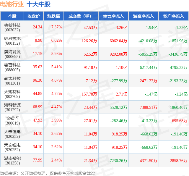 个股表现方面,电池行业当日领涨股为德新科技(603032),该股当日报收24.34,上涨7.37%,成交量47.53万,主力资金净流入3.26亿元。维科技术(600152)以上涨6.02%紧随其后,该股当日成交量126.26万,主力资金净流入6062.04万元。除此之外,滨海能源(000695)、容百科技(688005)、尚太科技(001301)均进入当日牛股之列。具体个股列表见下表: