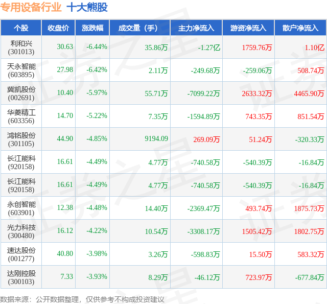 个股表现方面,专用设备行业当日领跌股为利和兴(301013),该股当日报收30.63,下跌6.44%,成交量35.86万,主力资金净流出1.27亿元。天永智能(603895)以下跌6.42%紧随其后,该股当日成交量2.11万,主力资金净流出249.68万元。除此之外,冀凯股份(002691)、华菱精工(603356)、鸿铭股份(301105)均进入当日熊股之列。具体个股列表见下表:
