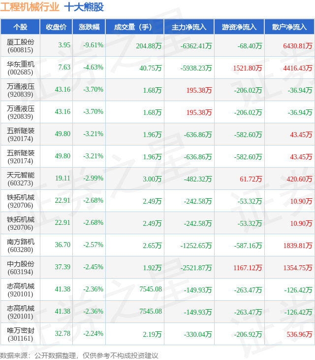个股表现方面,工程机械行业当日领跌股为厦工股份(600815),该股当日报收3.95,下跌9.61%,成交量204.88万,主力资金净流出6362.41万元。华东重机(002685)以下跌4.63%紧随其后,该股当日成交量40.75万,主力资金净流出5938.23万元。除此之外,万通液压(920839)、万通液压(920839)、五新隧装(920174)均进入当日熊股之列。具体个股列表见下表: