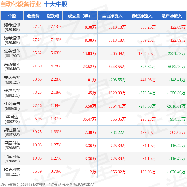 个股表现方面,自动化设备行业当日领涨股为海希通讯(920405),该股当日报收27.21,上涨7.13%,成交量8.38万,主力资金净流入3013.18万元。海希通讯(920405)以上涨7.13%紧随其后,该股当日成交量8.38万,主力资金净流入3013.18万元。除此之外,宏英智能(001266)、东杰智能(300486)、安达智能(688125)均进入当日牛股之列。具体个股列表见下表: