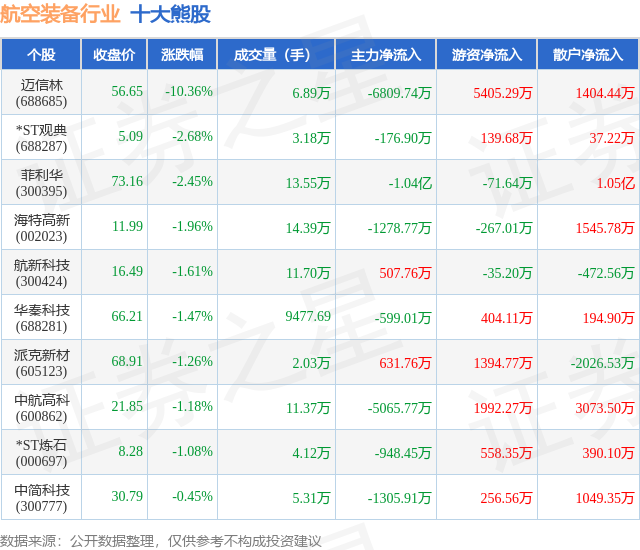 个股表现方面,航空装备行业当日领跌股为迈信林(688685),该股当日报收56.65,下跌10.36%,成交量6.89万,主力资金净流出6809.74万元。*ST观典(688287)以下跌2.68%紧随其后,该股当日成交量3.18万,主力资金净流出176.9万元。除此之外,菲利华(300395)、海特高新(002023)、航新科技(300424)均进入当日熊股之列。具体个股列表见下表: