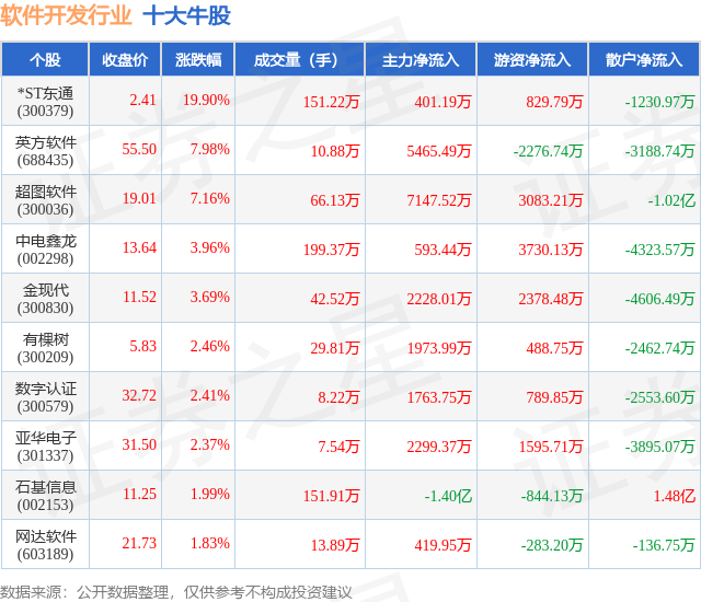 个股表现方面,软件开发行业当日领涨股为*ST东通(300379),该股当日报收2.41,上涨19.9%,成交量151.22万,主力资金净流入401.19万元。英方软件(688435)以上涨7.98%紧随其后,该股当日成交量10.88万,主力资金净流入5465.49万元。除此之外,超图软件(300036)、中电鑫龙(002298)、金现代(300830)均进入当日牛股之列。具体个股列表见下表: