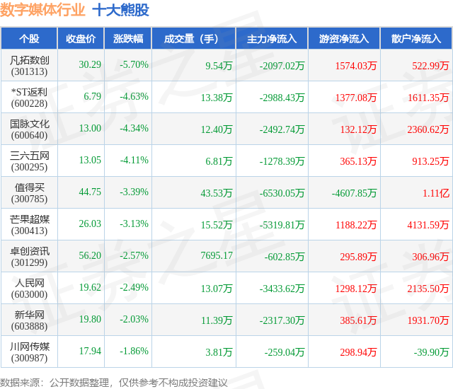 个股表现方面,数字媒体行业当日领跌股为凡拓数创(301313),该股当日报收30.29,下跌5.7%,成交量9.54万,主力资金净流出2097.02万元。*ST返利(600228)以下跌4.63%紧随其后,该股当日成交量13.38万,主力资金净流出2988.43万元。除此之外,国脉文化(600640)、三六五网(300295)、值得买(300785)均进入当日熊股之列。具体个股列表见下表:
