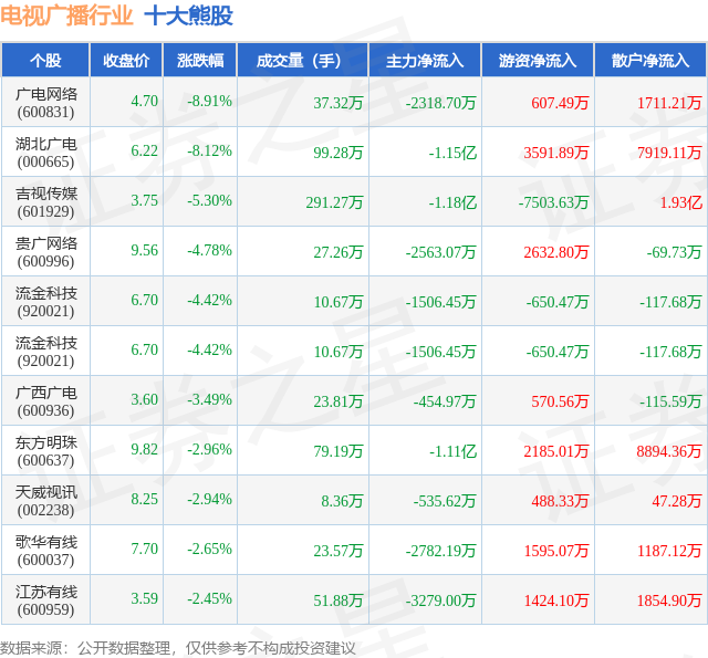 个股表现方面,电视广播行业当日领跌股为广电网络(600831),该股当日报收4.7,下跌8.91%,成交量37.32万,主力资金净流出2318.7万元。湖北广电(000665)以下跌8.12%紧随其后,该股当日成交量99.28万,主力资金净流出1.15亿元。除此之外,吉视传媒(601929)、贵广网络(600996)、流金科技(920021)均进入当日熊股之列。具体个股列表见下表: