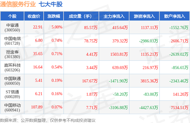 个股表现方面,通信服务行业当日领涨股为中富通(300560),该股当日报收22.91,上涨5.0%,成交量85.57万,主力资金净流入415.64万元。中国电信(601728)以上涨0.74%紧随其后,该股当日成交量78.75万,主力资金净流入379.32万元。除此之外,挖金客(301380)、嘉环科技(603206)、中国联通(600050)均进入当日牛股之列。具体个股列表见下表: