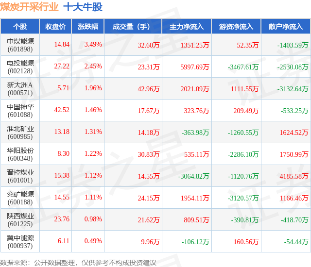 个股表现方面,煤炭开采行业当日领涨股为中煤能源(601898),该股当日报收14.84,上涨3.49%,成交量32.6万,主力资金净流入1351.25万元。电投能源(002128)以上涨2.45%紧随其后,该股当日成交量23.31万,主力资金净流入5997.69万元。除此之外,新大洲A(000571)、中国神华(601088)、淮北矿业(600985)均进入当日牛股之列。具体个股列表见下表: