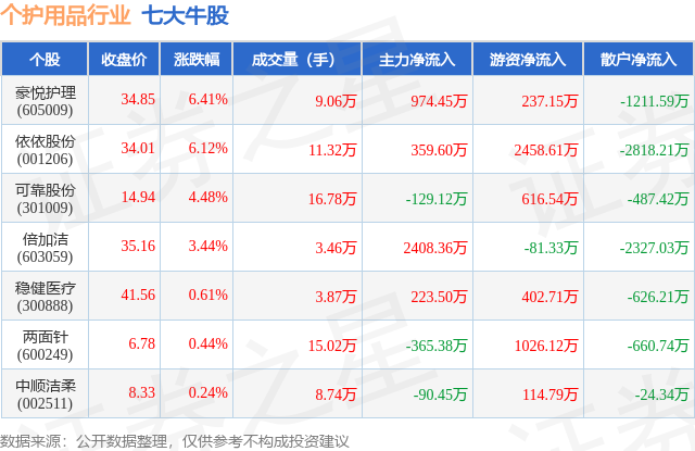 个股表现方面,个护用品行业当日领涨股为豪悦护理(605009),该股当日报收34.85,上涨6.41%,成交量9.06万,主力资金净流入974.45万元。依依股份(001206)以上涨6.12%紧随其后,该股当日成交量11.32万,主力资金净流入359.6万元。除此之外,可靠股份(301009)、倍加洁(603059)、稳健医疗(300888)均进入当日牛股之列。具体个股列表见下表: