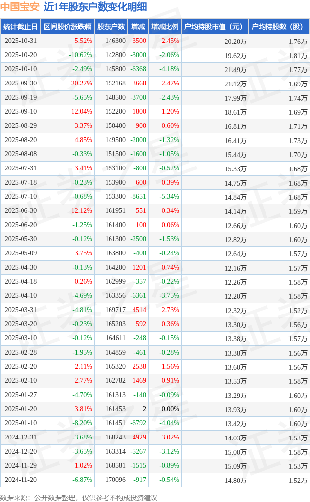 从股价来看,2025年10月20日至2025年10月31日,中国宝安区间涨幅为5.52%,在此期间股东户数增加3500.0户,增幅为2.45%。