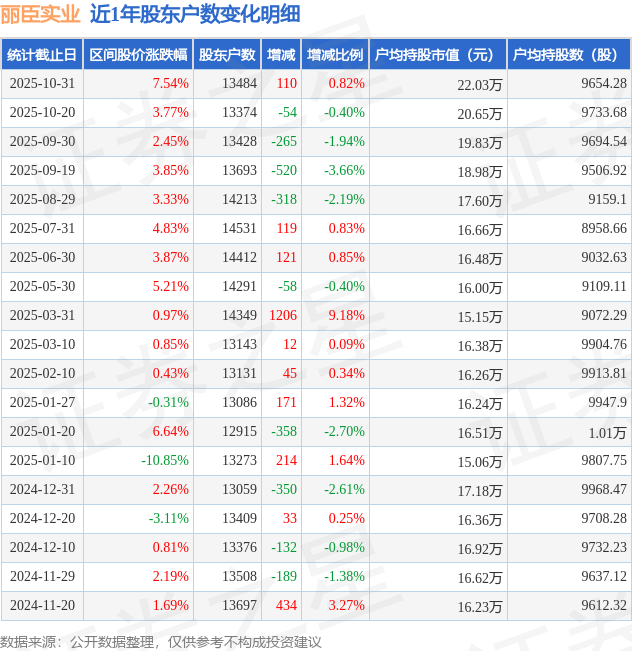 从股价来看,2025年10月20日至2025年10月31日,丽臣实业区间涨幅为7.54%,在此期间股东户数增加110.0户,增幅为0.82%。