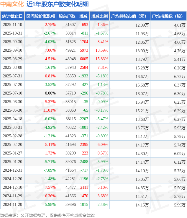 从股价来看,2025年10月31日至2025年11月10日,中南文化区间涨幅为2.75%,在此期间股东户数增加693.0户,增幅为1.36%。