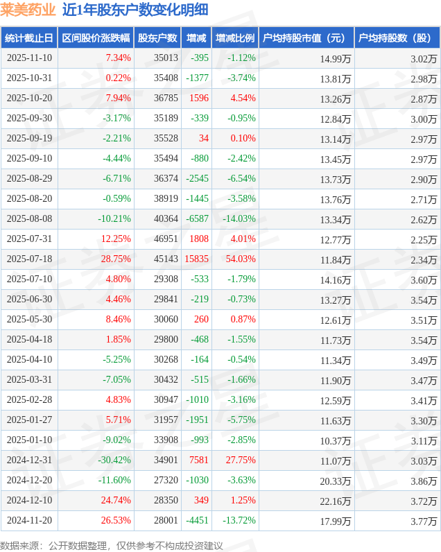 从股价来看,2025年10月31日至2025年11月10日,莱美药业区间涨幅为7.34%,在此期间股东户数减少395.0户,减幅为1.12%。