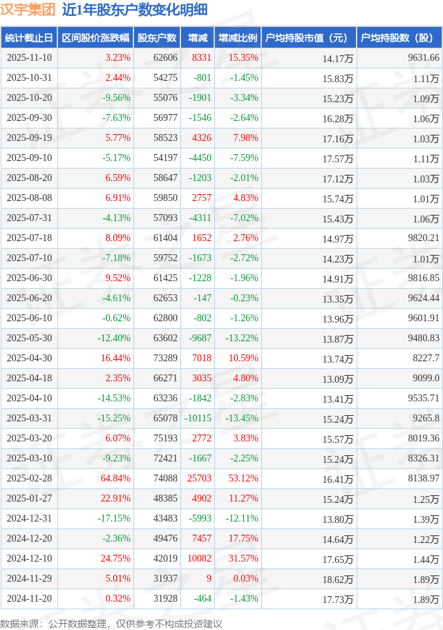 证券之星消息,近日汉宇集团披露,截至2025年11月10日公司股东户数为6.26万户,较10月31日增加8331.0户,增幅为15.35%。户均持股数量由上期的1.11万股减少至9632.0股,户均持股市值为14.17万元。