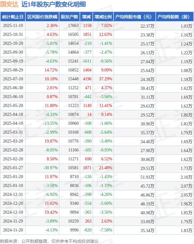 从股价来看,2025年10月31日至2025年11月10日,国安达区间涨幅为2.36%,在此期间股东户数增加1158.0户,增幅为7.02%。