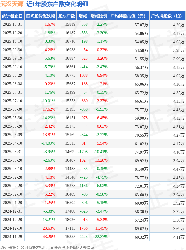 从股价来看,2025年10月20日至2025年10月31日,武汉天源区间涨幅为1.67%,在此期间股东户数减少368.0户,减幅为2.27%。