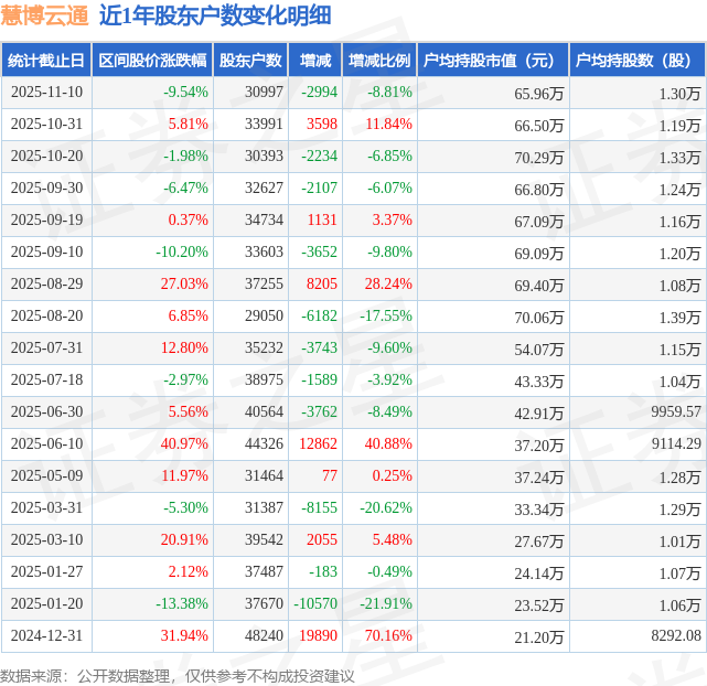 从股价来看,2025年10月31日至2025年11月10日,慧博云通区间跌幅为9.54%,在此期间股东户数减少2994.0户,减幅为8.81%。