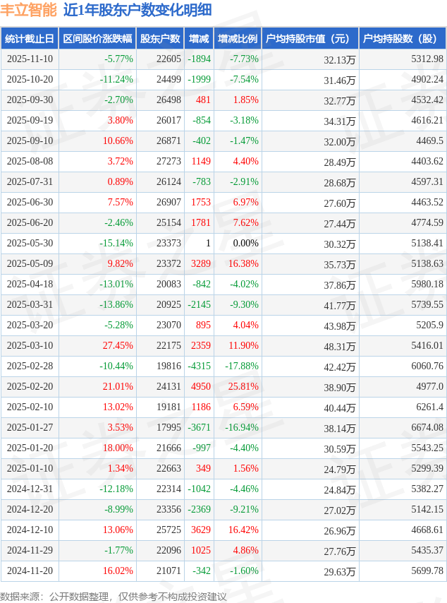 从股价来看,2025年10月20日至2025年11月10日,丰立智能区间跌幅为5.77%,在此期间股东户数减少1894.0户,减幅为7.73%。