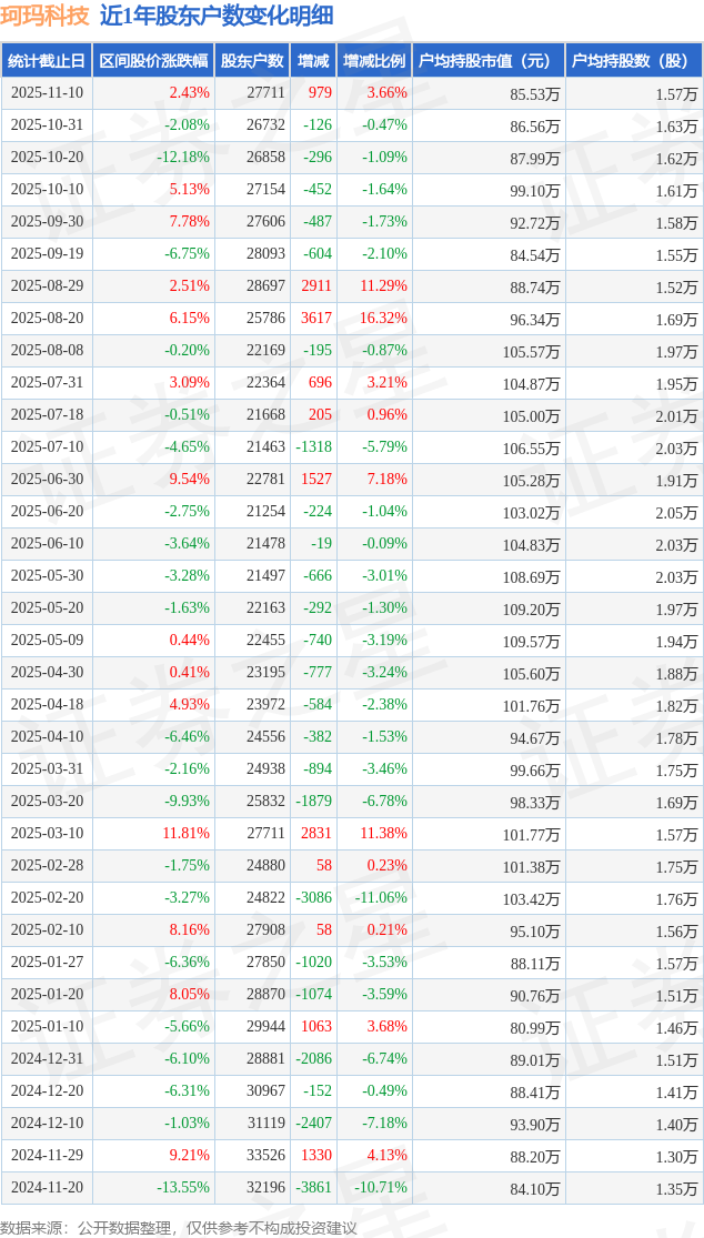 从股价来看,2025年10月31日至2025年11月10日,珂玛科技区间涨幅为2.43%,在此期间股东户数增加979.0户,增幅为3.66%。