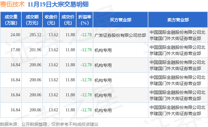 证券之星消息,11月19日赛伍技术发生大宗交易,交易数据如下: