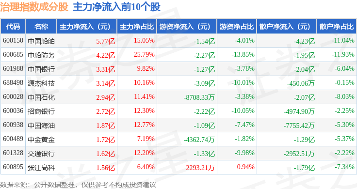 资金流向方面,治理指数(000019)成份股当日主力资金净流出合计21.18亿元,游资资金净流出合计7.76亿元,散户资金净流入合计28.95亿元。成份股资金流向详情见下表: