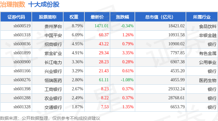 证券之星消息,11月19日,治理指数(000019)报收于1228.6点,涨0.53%,成交1315.42亿元,换手率0.39%。当日该指数成份股中,上涨的有106家,中船防务以10.0%的涨幅领涨,下跌的有187家,九洲药业以6.24%的跌幅领跌。