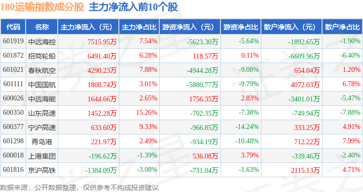 资金流向方面,180运输(000027)指数成份股当日主力资金净流出合计438.9万元,游资资金净流出合计1.15亿元,散户资金净流入合计1.2亿元。成份股资金流向详情见下表:
