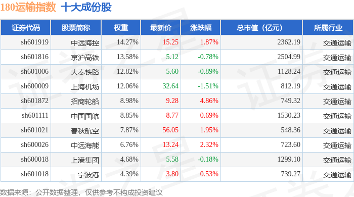 证券之星消息,11月19日,180运输(000027)指数报收于785.37点,涨0.68%,成交59.44亿元,换手率0.38%。当日该指数成份股中,上涨的有8家,招商轮船以4.86%的涨幅领涨,下跌的有5家,上海机场以1.51%的跌幅领跌。