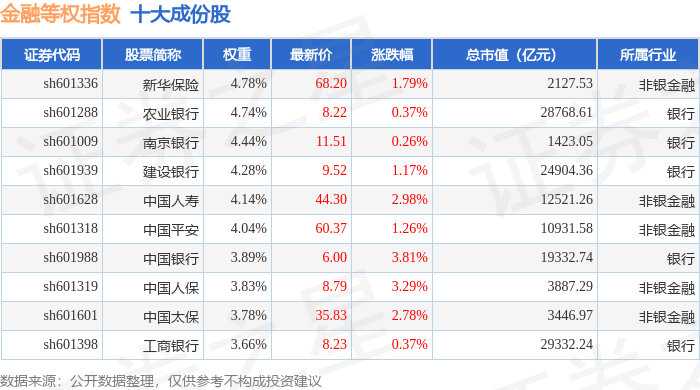 证券之星消息,11月19日,金融等权(000076)指数报收于5727.83点,涨1.17%,成交374.87亿元,换手率0.26%。当日该指数成份股中,上涨的有26家,中国银行以3.81%的涨幅领涨,下跌的有3家,中金公司以0.4%的跌幅领跌。