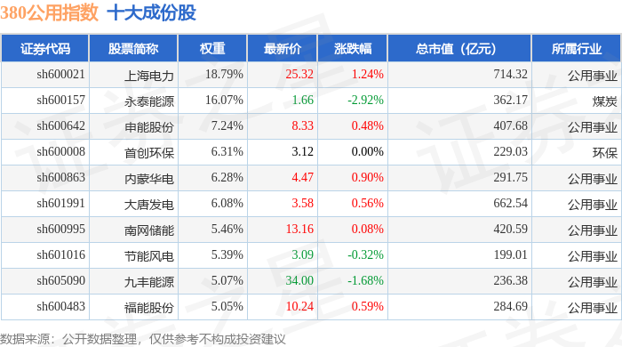 380公用(000113)指数十大成份股详情如下: