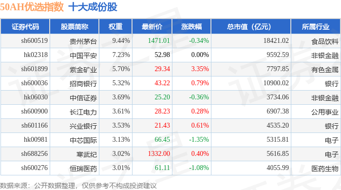 证券之星消息,11月19日,50AH优选(000170)指数报收于6228.56点,涨0.22%,成交678.78亿元,换手率0.39%。当日该指数成份股中,上涨的有28家,紫金矿业以3.35%的涨幅领涨,下跌的有20家,中国中免以2.53%的跌幅领跌。