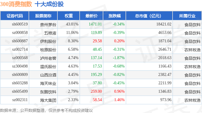 证券之星消息,11月19日,300消费(000912)指数报收于22172.99点,跌0.33%,成交117.18亿元,换手率0.47%。当日该指数成份股中,上涨的有6家,海大集团以1.46%的涨幅领涨,下跌的有11家,泸州老窖以1.87%的跌幅领跌。