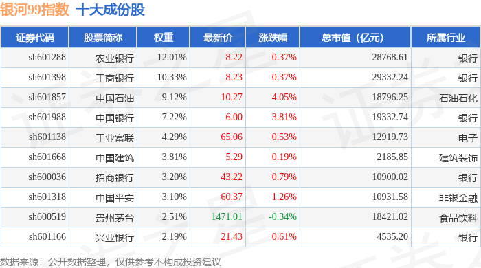 证券之星消息,11月19日,银河99(000959)指数报收于8313.69点,涨1.19%,成交1986.83亿元,换手率0.34%。当日该指数成份股中,上涨的有58家,中金黄金以8.76%的涨幅领涨,下跌的有39家,小商品城以2.68%的跌幅领跌。