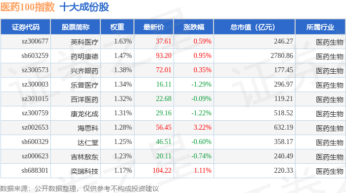 证券之星消息,11月19日,医药100(000978)指数报收于10995.29点,跌0.93%,成交266.97亿元,换手率0.83%。当日该指数成份股中,上涨的有14家,海思科以3.22%的涨幅领涨,下跌的有85家,美年健康以3.33%的跌幅领跌。