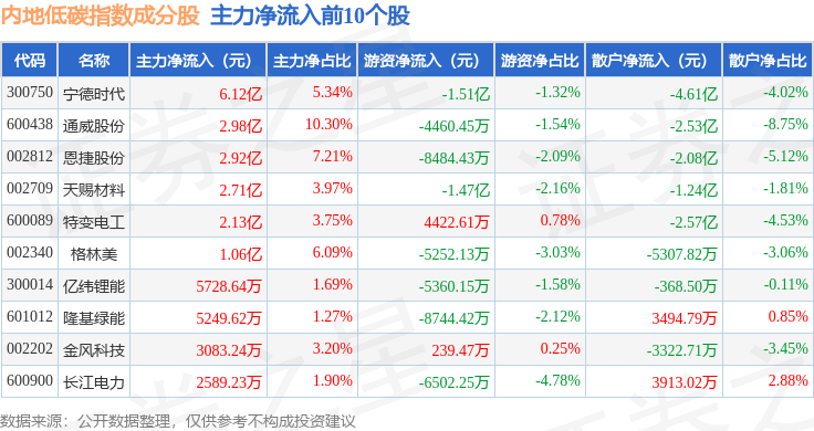 资金流向方面,内地低碳(000977)指数成份股当日主力资金净流入合计4859.84万元,游资资金净流出合计4.52亿元,散户资金净流入合计3.96亿元。成份股资金流向详情见下表: