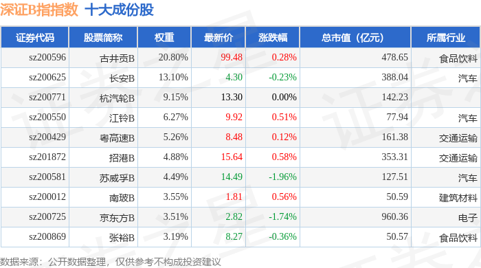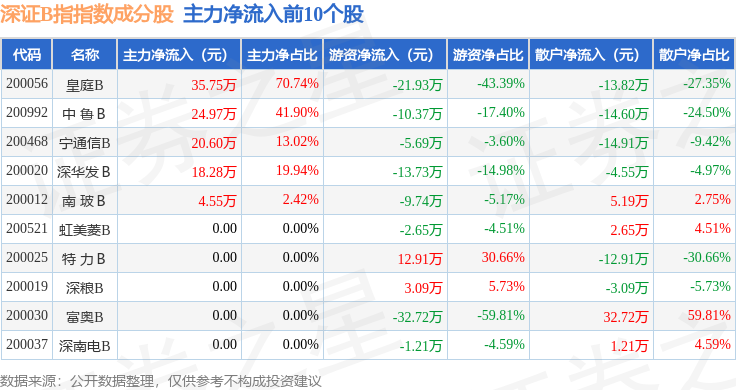 资金流向方面,深证B指(399108)指数成份股当日主力资金净流出合计933.38万元,游资资金净流入合计302.0万元,散户资金净流入合计631.37万元。成份股资金流向详情见下表: