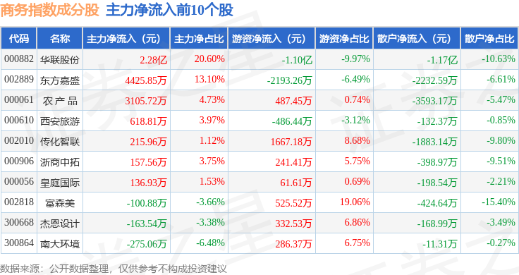 资金流向方面,商务指数(399242)成份股当日主力资金净流出合计24.33亿元,游资资金净流入合计3.98亿元,散户资金净流入合计20.34亿元。成份股资金流向详情见下表:
