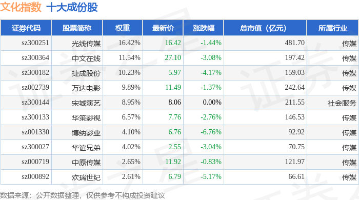 文化指数(399248)十大成份股详情如下: