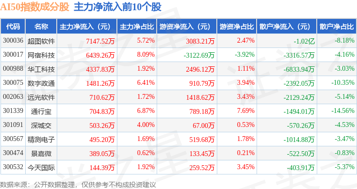 资金流向方面,AI50(399284)指数成份股当日主力资金净流出合计23.04亿元,游资资金净流入合计5.52亿元,散户资金净流入合计17.52亿元。成份股资金流向详情见下表: