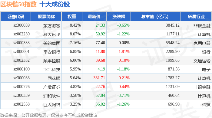 区块链50(399286)指数十大成份股详情如下: