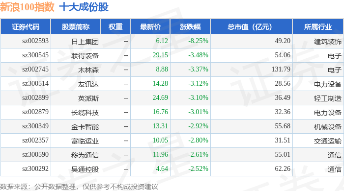 证券之星消息,11月19日,新浪100(399297)指数报收于6074.27点,跌1.09%,成交150.74亿元,换手率1.75%。当日该指数成份股中,上涨的有14家,中电环保以6.93%的涨幅领涨,下跌的有83家,日上集团以8.25%的跌幅领跌。